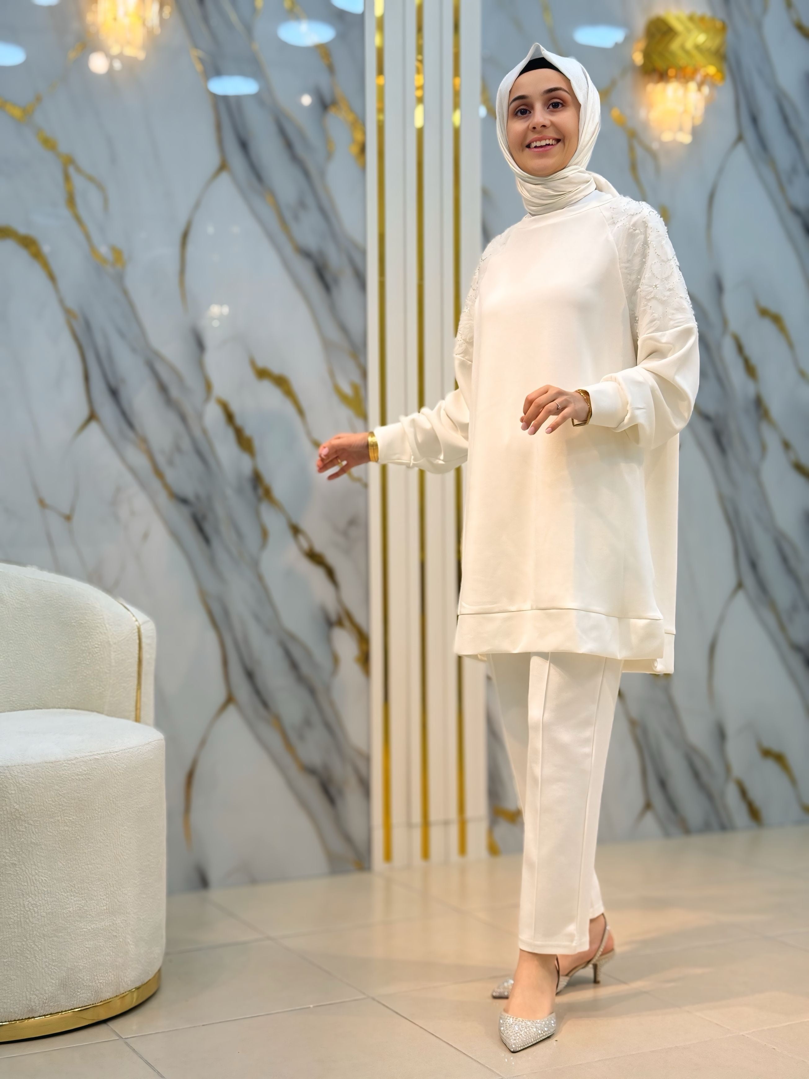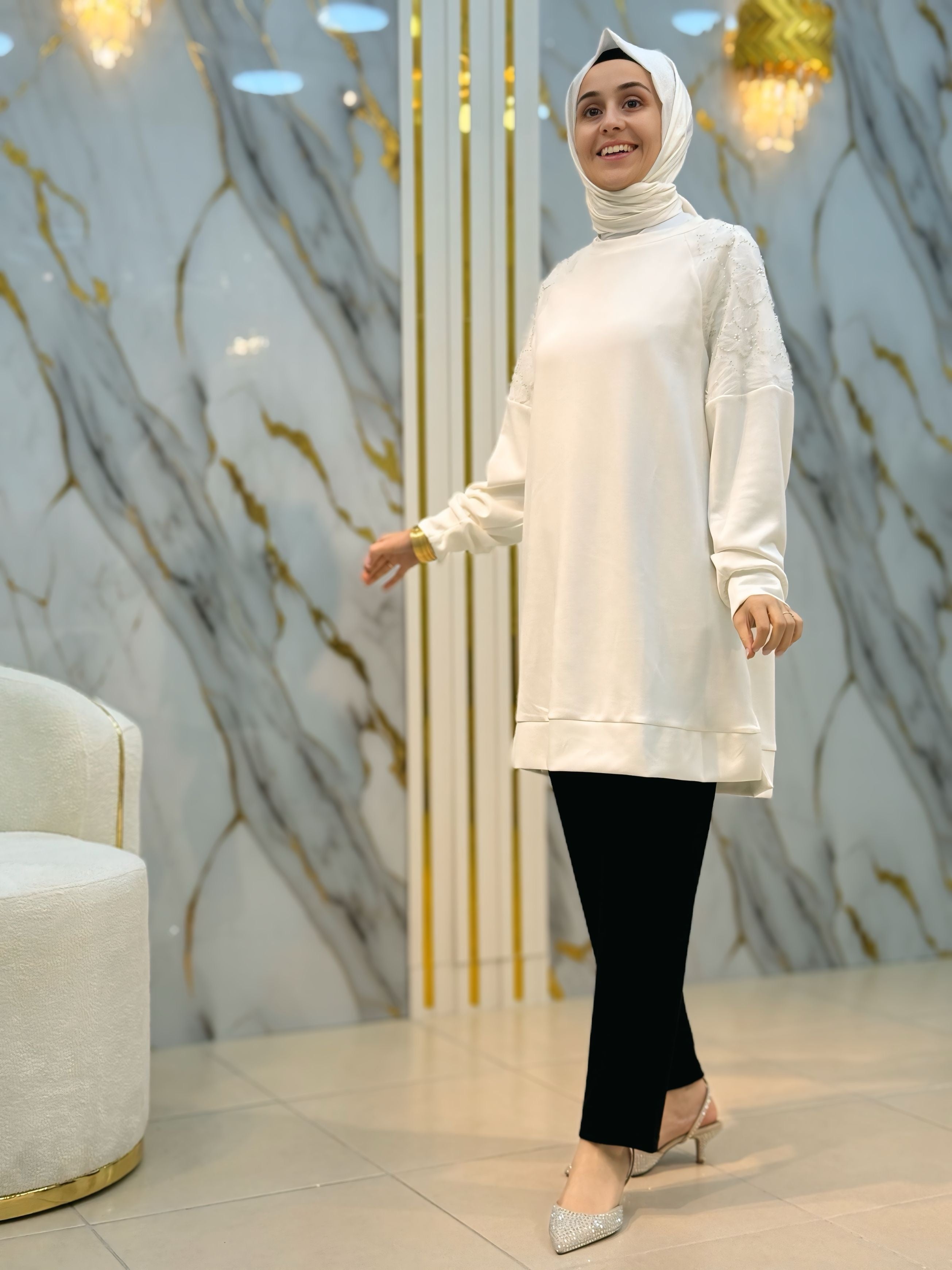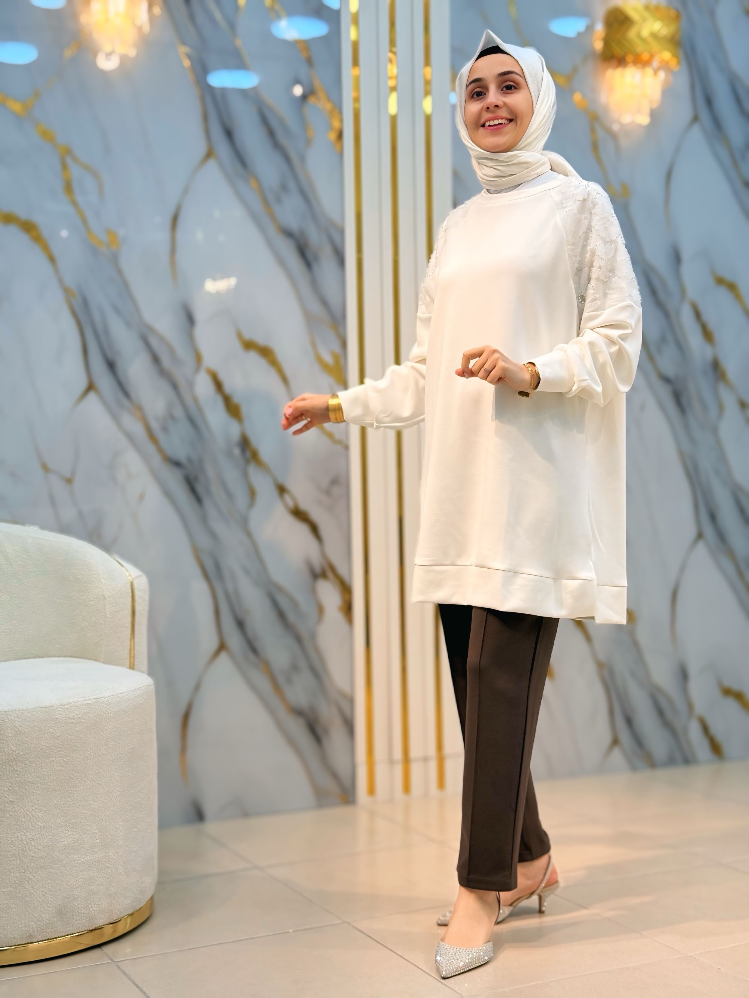 NY MEHLİKA YAKA TAŞLI KOL DANTEL VE İNCİ DETAY SOĞUK İP TUNİK 280