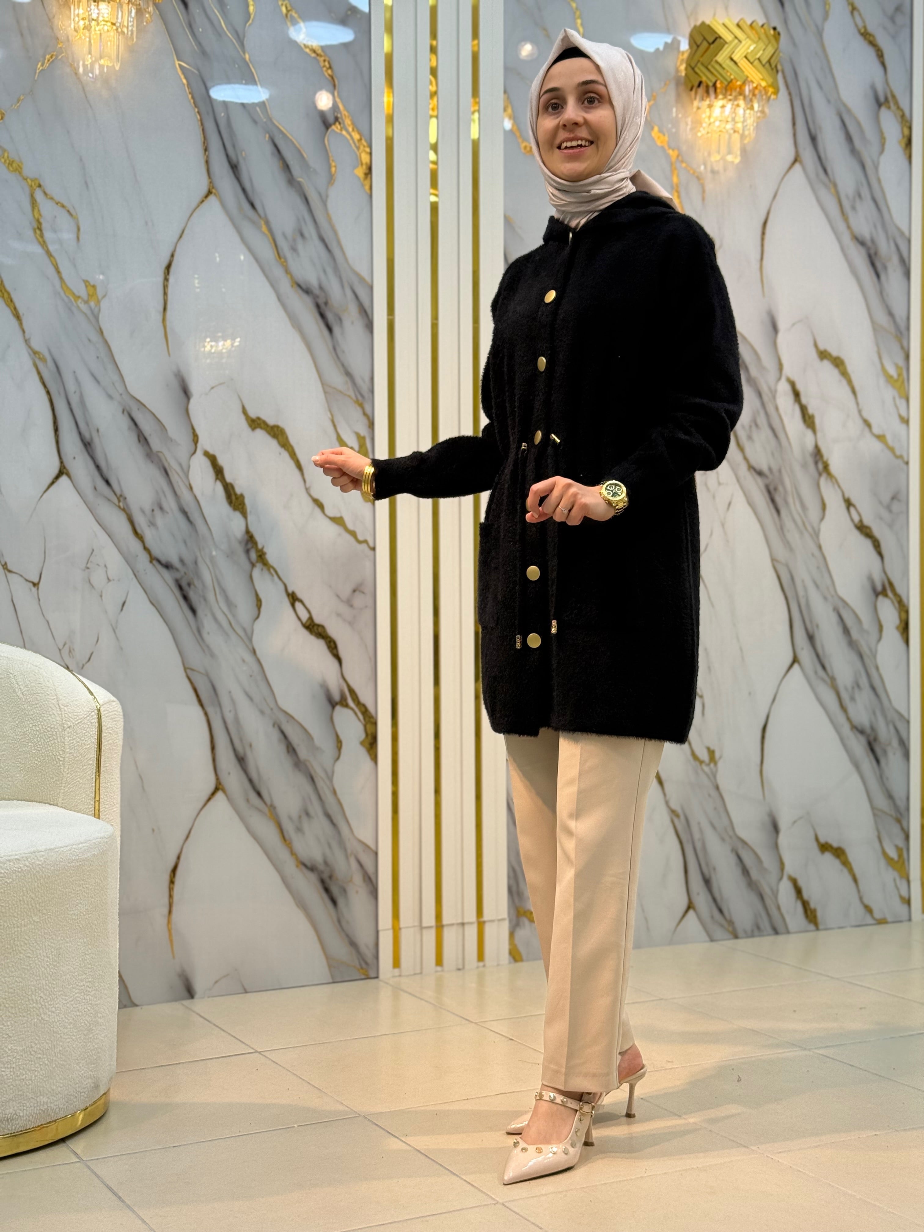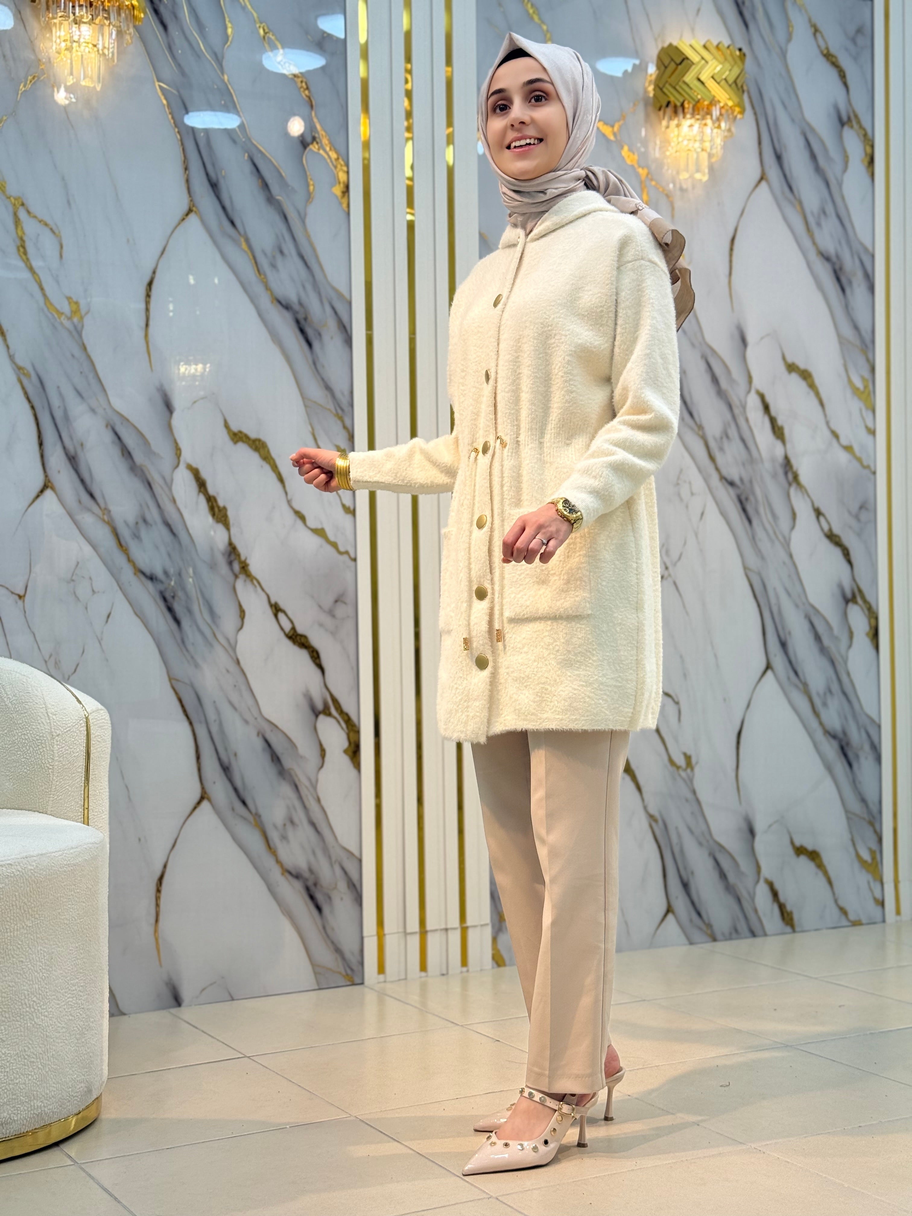 NY MEHLİKA ANGORA BELİ BÜZGÜ DETAYLI KAPUŞONLU HIRKA 251407 – NY MEHLİKA EXCLUSİVE