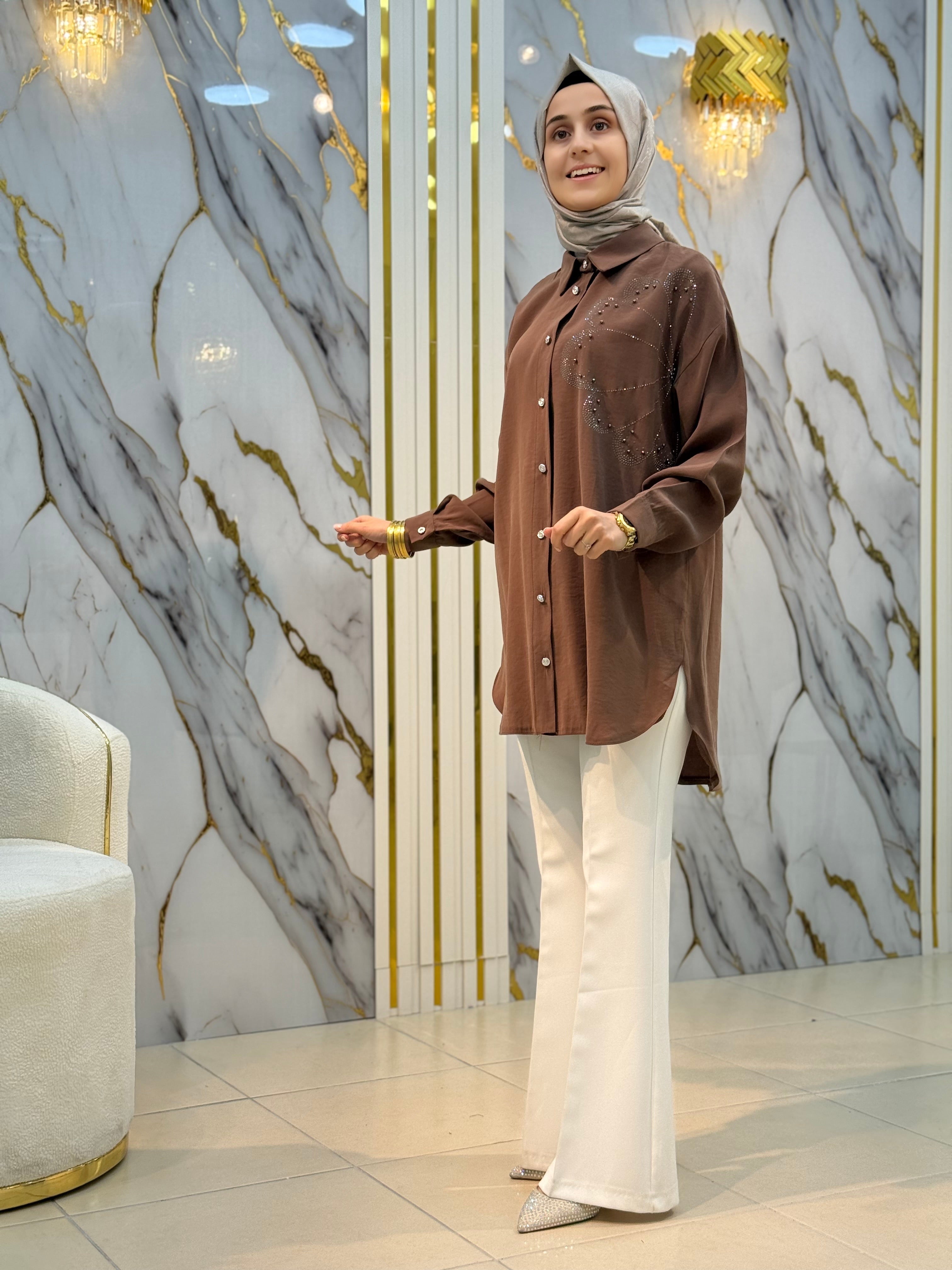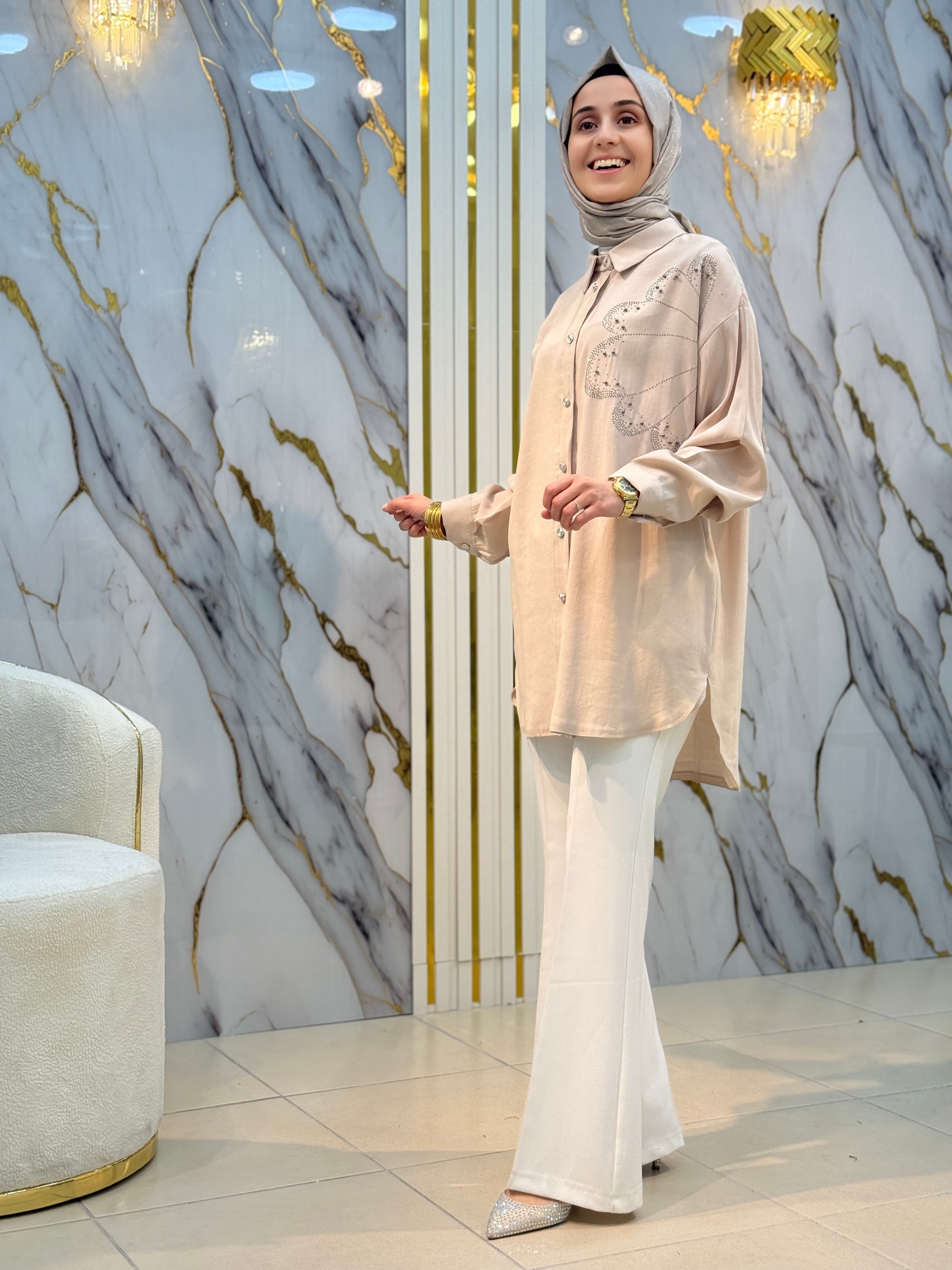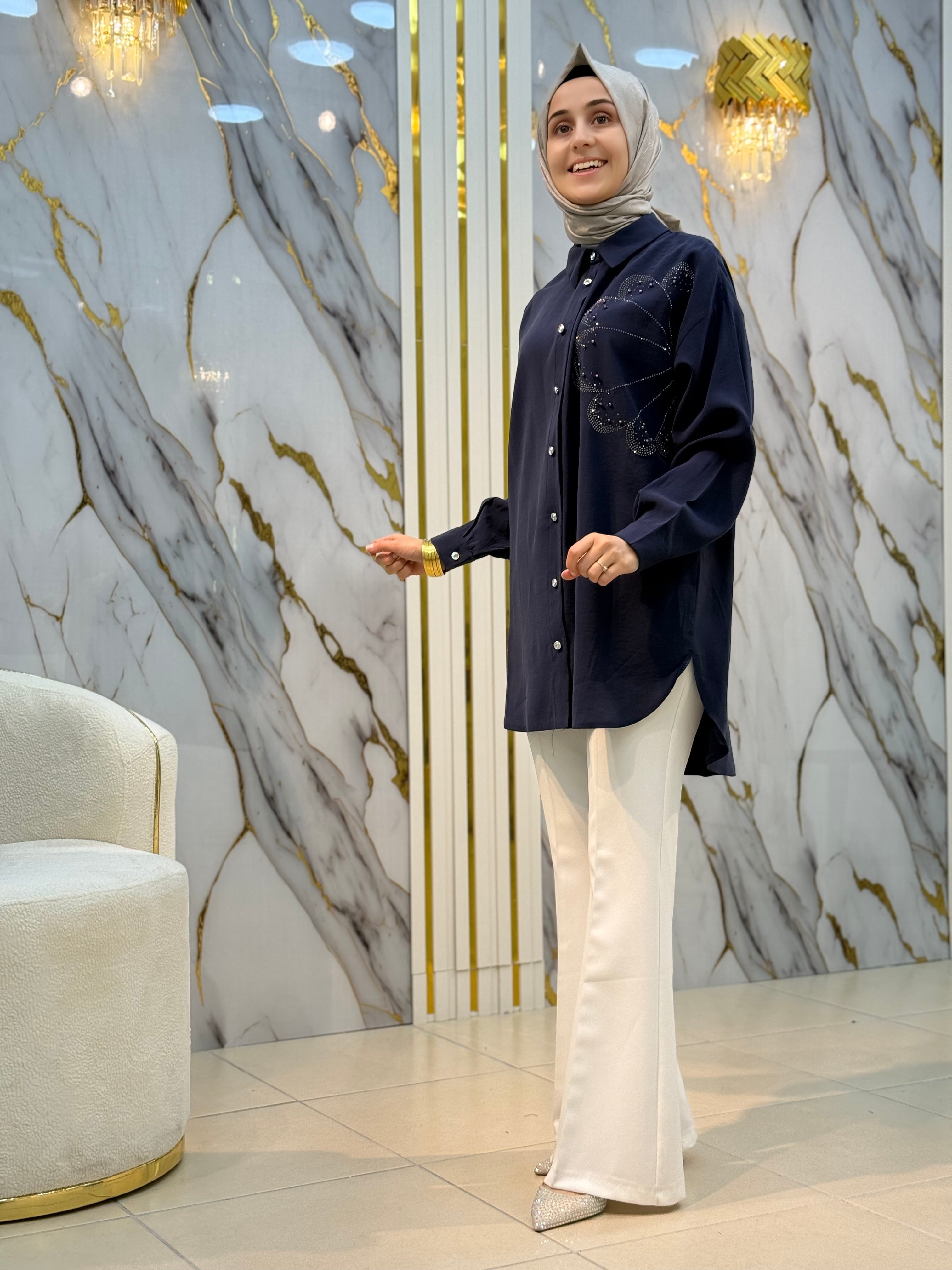 NY MEHLİKA ÇİÇEK TAŞ İŞLEME TENSEL KUPRA GÖMLEK 2849