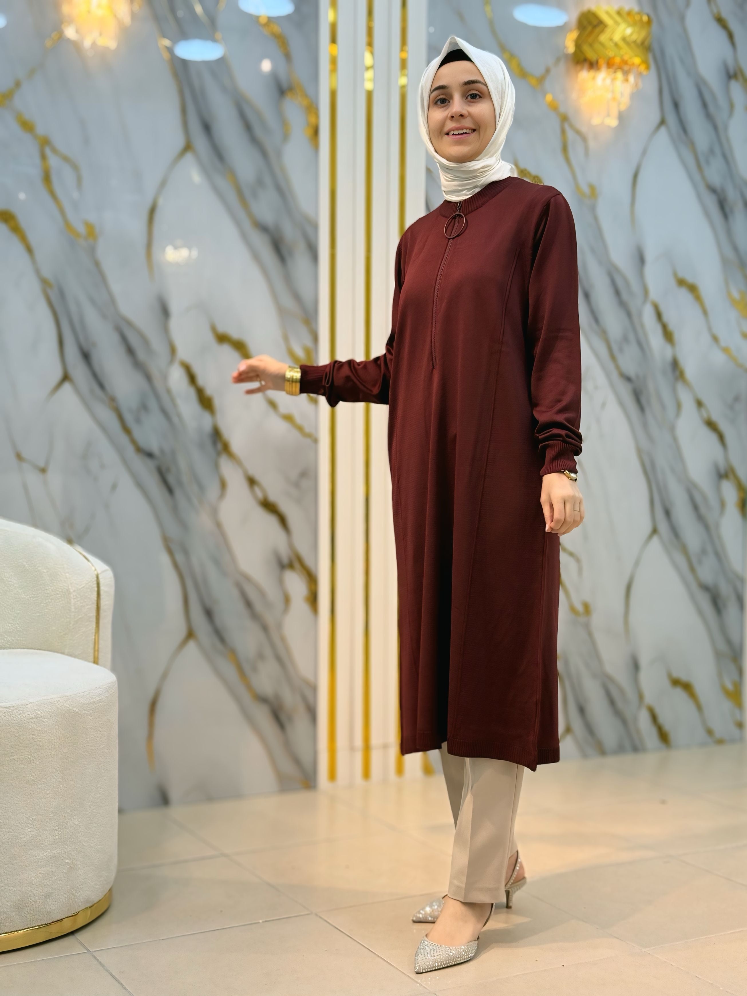 NY MEHLİKA ÖNÜ ÇİZGİ DETAY YIRTMAÇLI UZUN SOĞUK İP TUNİK 35244